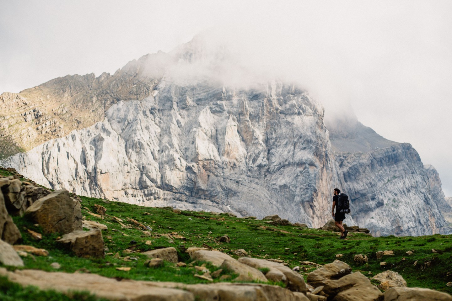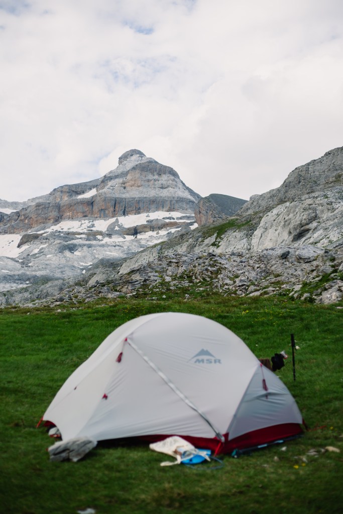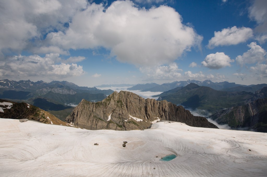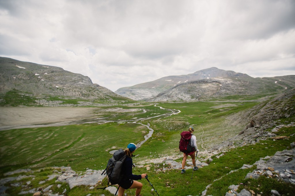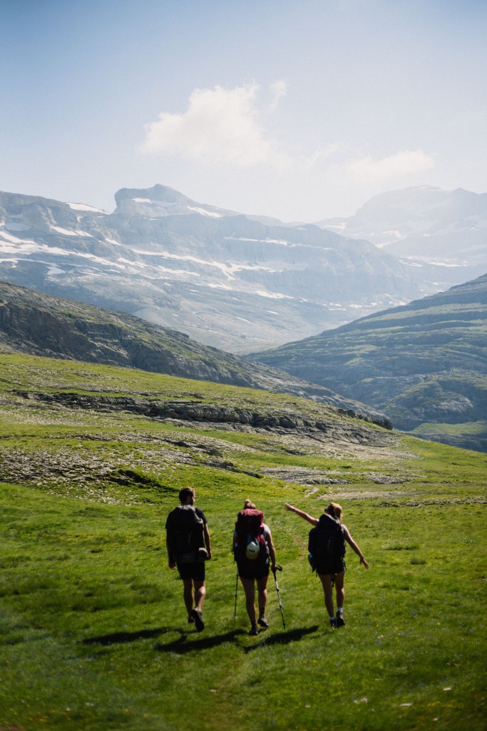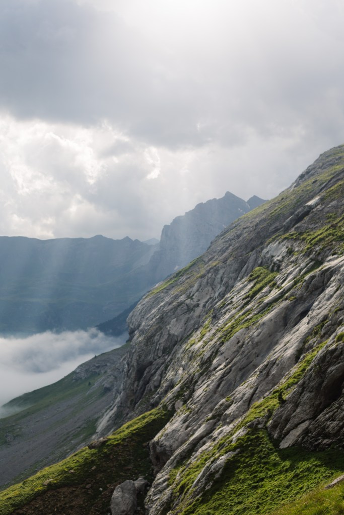 Troisième journée de trek, des paysages encore somptueux, un canyon vertigineux et nous découvrons le Mont Perdu, qui disparait petit à petit dans les nuages. La météo se gâte et nous ne pourrons pas passer par l’itinéraire prévu, trop dangereux, nous rajouterons donc des kilomètres et du dénivelé en descendant dans la vallée pour ensuite remonter au prochain col.