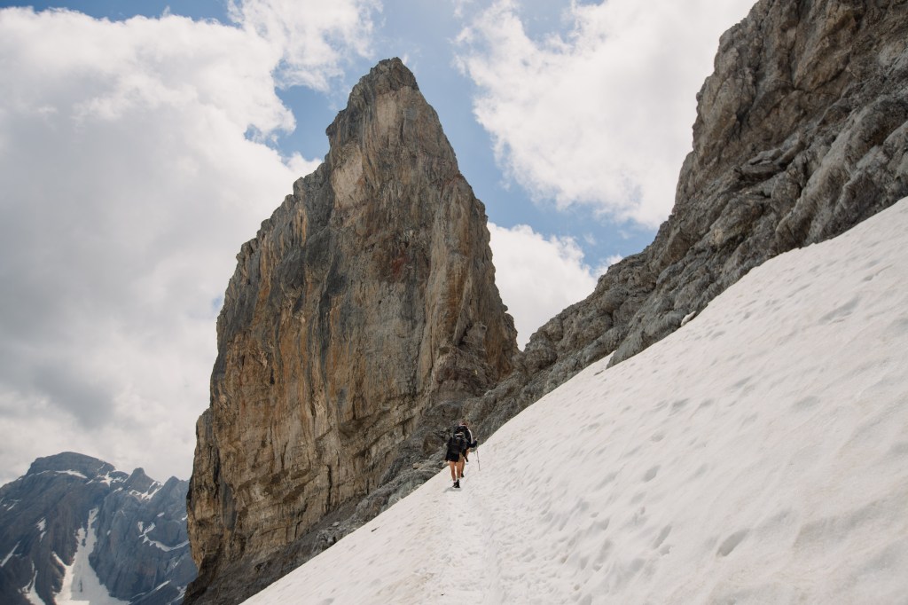 La neige fait elle aussi son apparition. Toujours bien présente en ce début d’été, une bonne partie de l’ascension se fait les pieds dans la neige, le bonheur ! L’approche de la brèche est grandiose. La montée aura été longue car technique ou enneigée.