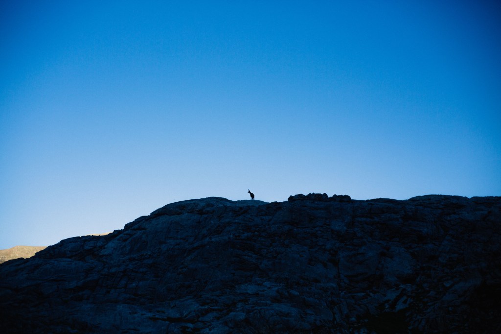 Une bonne descente technique à travers les rochers et une magnifique plaine s’offre à nous, entre montagnes et canyon. De belles rencontres sauvages, de nombreux isards rodent autour de notre bivouac. Sur cette plaine, pas d’eau. Nous faisons donc fondre la neige encore présente, que nous filtrons ensuite.